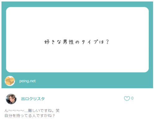 今まで、ご本人も自身の恋愛について多く語られることはなく、週刊誌などでスクープされたりすることはありませんでしたが、以前にTwitter(現X)の質問箱にてファンからのクリスタさんの恋愛に関する質問に対して丁寧に答えています。